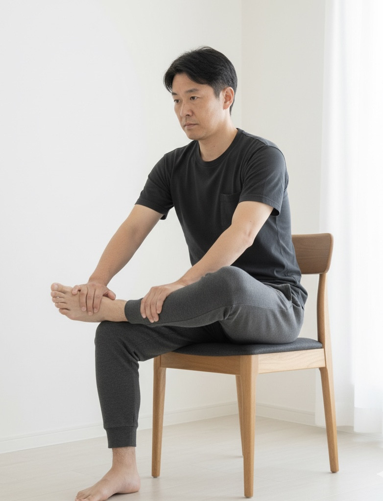 長時間のデスクワークやスマホ操作で固まりがちな股関節は、腰痛の直接的な原因です。この体操で、股関節の連動性を高め、骨盤の安定を取り戻しましょう。