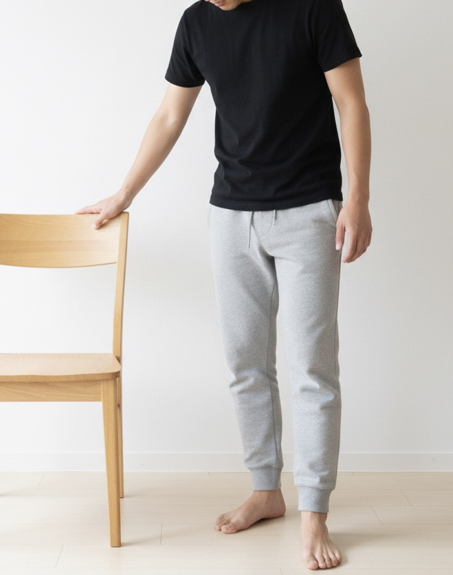 1. 壁や椅子の背もたれに手を軽く添えて立ちます。