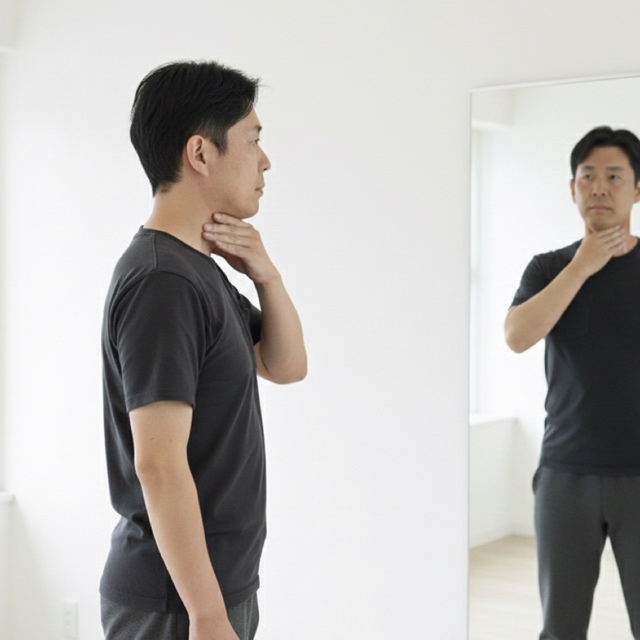 1.鏡を見ながら、耳の下~鎖骨につながる筋肉(胸鎖乳突筋)を軽くつまむ