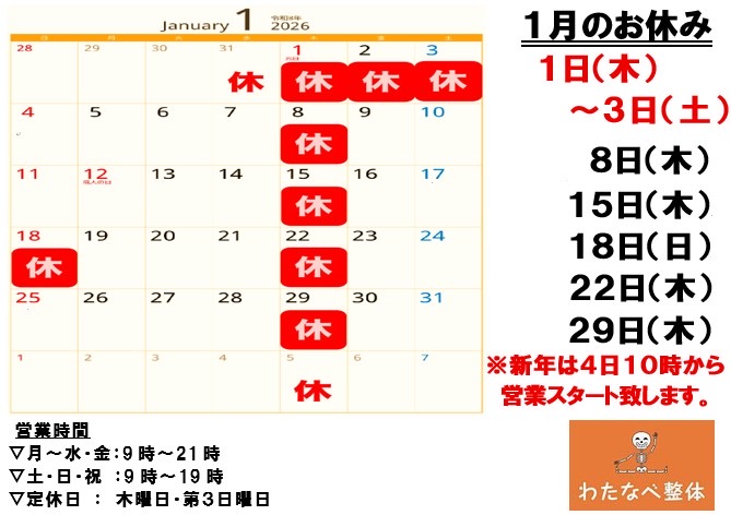 1月の営業&お休み|身体の使い方が乱れやすい時期